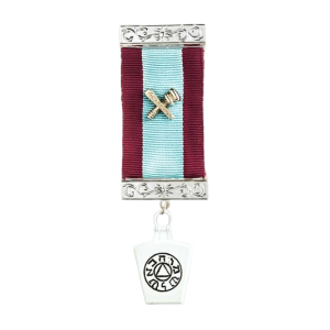 The breast jewel is an ivory (or other material) keystone having a silver lewis which is suspended from a one-inch silver bar by a ribbon in the same colours as the apron. Each face of the keystone bears certain characters, on the reverse in English and on the Obverse in Hebrew.