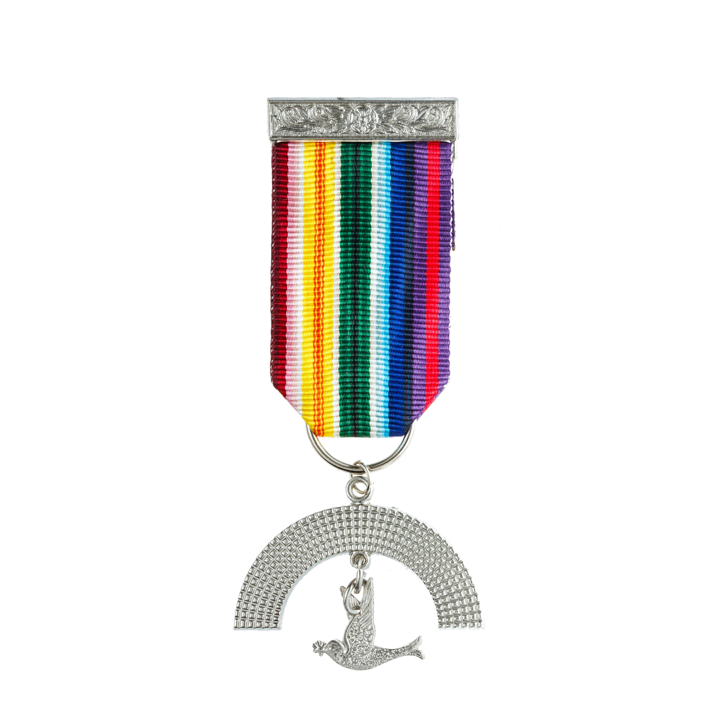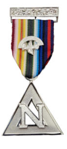 The breast jewel is a segmental plat of silver representing a rainbow from which is suspended a dove bearing an olive branch in its beak; this is suspended from a rainbow ribbon and silver bar. Past Commanders may also wear a jewel featuring the initial N within a triangle hanging from a similar ribbon.